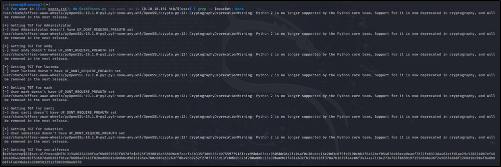 Now I can use the Impacket tool GetNPUsers.py to try to get a hash for each user, and I find one for the svc-alfresco account.