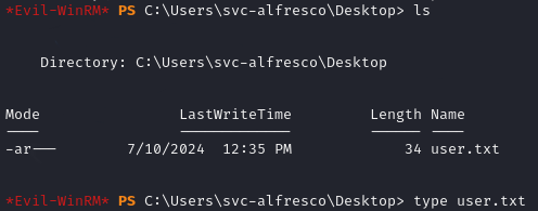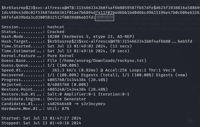 svc-alfresco is a service account. Searching for alfresco online brings us to this setup documentation. According to this, the service needs Kerberos pre-authentication to be disabled. This means that we can request the encrypted TGT for this user. As the TGT contains material that is encrypted with the user's NTLM hash, we can subject this to an offline brute force attack, and attempt to get the password for svc-alfresco.