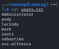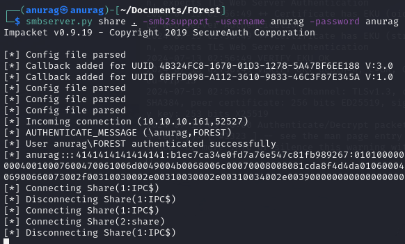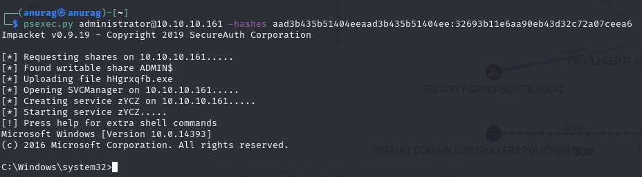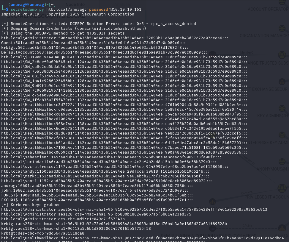 Now, the secretsdump script from Impacket can be run as anurag and used to reveal the NTLM hashes for all domain users: