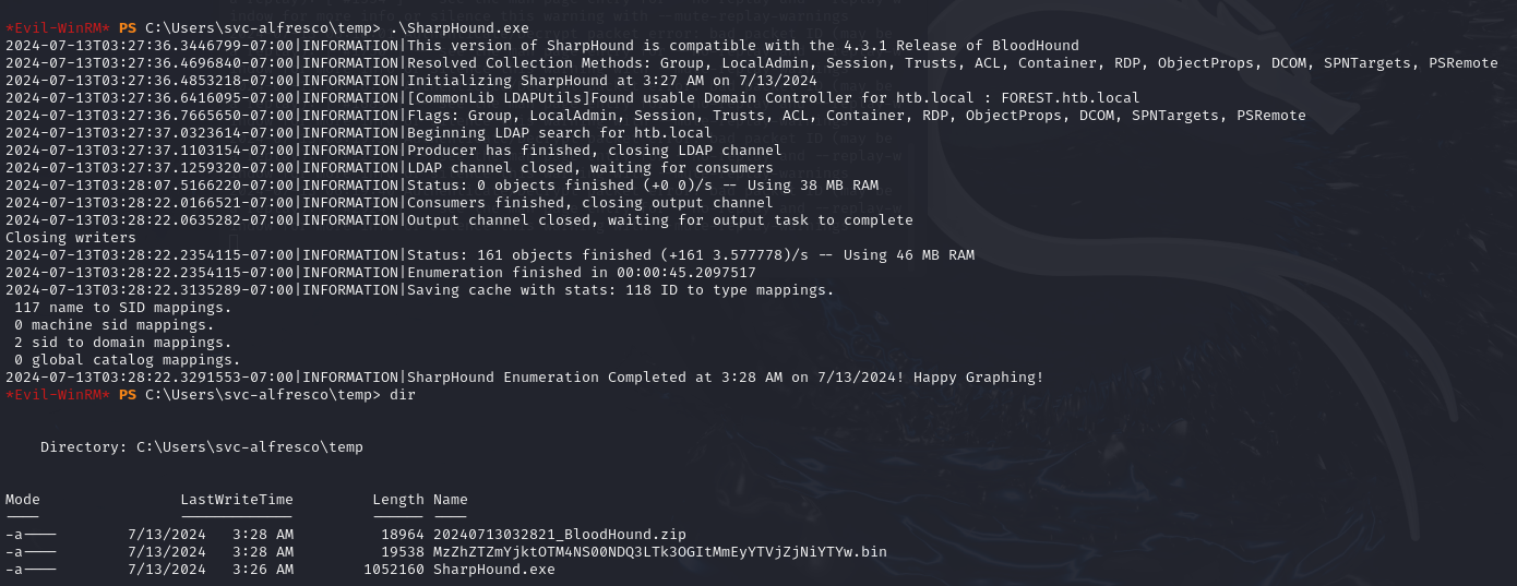 With my shell, I'll run Sharphound (SharpHound v1.1.1) to collect data for BloodHound.