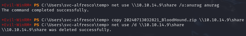 Once done, this will generate 2 files: a zip file and a bin file. Our task is to copy the zip file to our Kali machine so that we can feed it to our BloodHound tool.