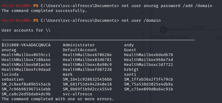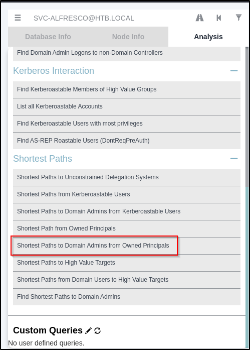 Upload the zip file in BloodHound. In BloodHound, on the top left side, you will see a search bar. Search for svc-alfresco in it. In the middle of the screen, you will be able to see svc-alfresco. Right-click on it and select "Mark user as owned". Now in the query, select "Find shortest path to domain admins".