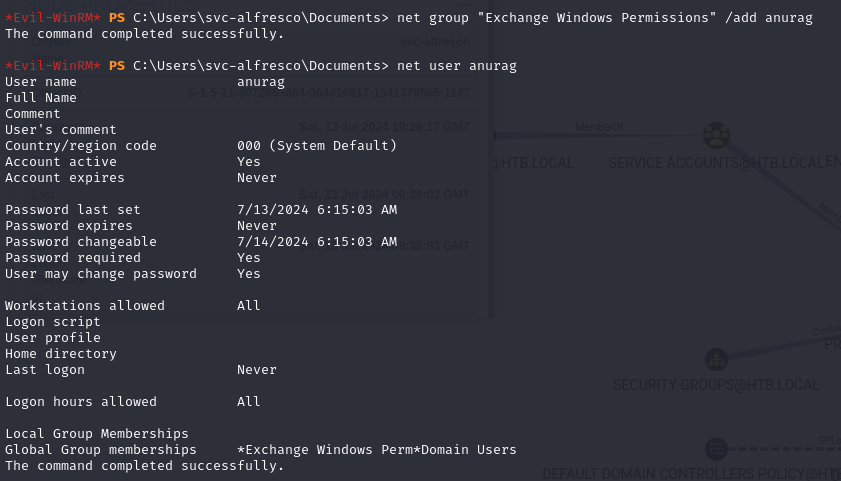One of the paths shows that the Exchange Windows Permissions group has WriteDacl privileges on the Domain. The WriteDACL privilege gives a user the ability to add ACLs to an object. This means that we can add a user to this group and give them DCSync privileges.